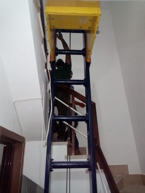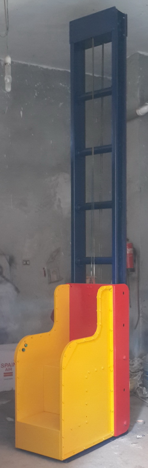 1. مصعد لدور واحد صناعة مصرية بمكونات جاهزة أوروبية المنشأ. 2. هيكل المصعد مصنع من الواح الصلب تخانة 5 مم 3. جسم الكابينة مصنع من ألواح الصلب تخانة 2 مم 4. المساحة الداخلية للكابينة 60 سم في 80 سم (يمكن تغييرها أثناء التصنيع حسب أبعاد الموقع) 5. المصعد يعمل بين طابقين المسافة بينها حتي 320 سم 6. يمكن زيادة مشوار المصعد بتكلفة أضافية حسب المكان 7. سرعة المصعد هي 10 ثواني للدور الواحد 8. المصعد يعمل عن طريق موتور كهربي 3 حصان 220 فولت 60 هيرتز ومزود بمخفض للسرعة 9. يتم رفع الكابينة بكابلات من الصلب قطر 8 مم ومتصلة بمخفض السرعة وتتحرك علي بكرات خاصة 10. يتم تثبيت المصعد علي أرضية المبني ويجب تجهيز المبني سلفا بأبواب دخول وخروج للمصعد 11. المصعد مزود بأزرار تحكم علي جانب الكابينة للتشغيل. 12. أزرار التحكم تحتوي علي مفتاح للصعود وآخر للنزول بالإضافة الي لمبة بيان 13. يتحرك المصعد بالضغط علي زرار الرفع أو الإنزال ويتوقف المصعد بمجرد ترك الزرار 14. مسار المصعد مزود بمفاتيح إيقاف كهربية يتم ضبطها حسب المسافة بين الدورين. 15. حمولة المصعد 150 كجم بخلاف وزن الكابينة 16. وزن كابينة المصعد فارغة 70 كجم 17. يتم دهان المصعد بالدهان العازل للصدأ وطبقتين من اللون المطلوب.